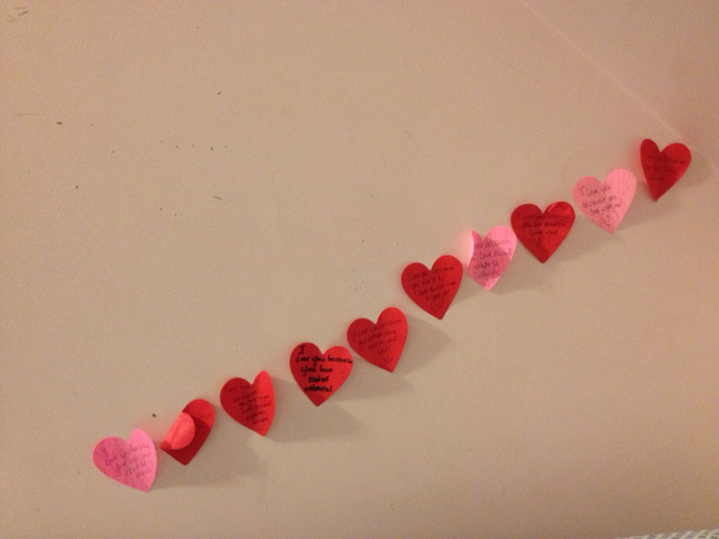 So at the beginning of February I started writing love notes to my family. Each day each member of the family got an “I love you because…” note. As the days passed, the notes became more interesting. I had to find individual characteristics to write about each person. The family…at least 10 and 14 ….came to look forward to the notes. On the 14th I wrote each one a card and made their valentines lunches.
