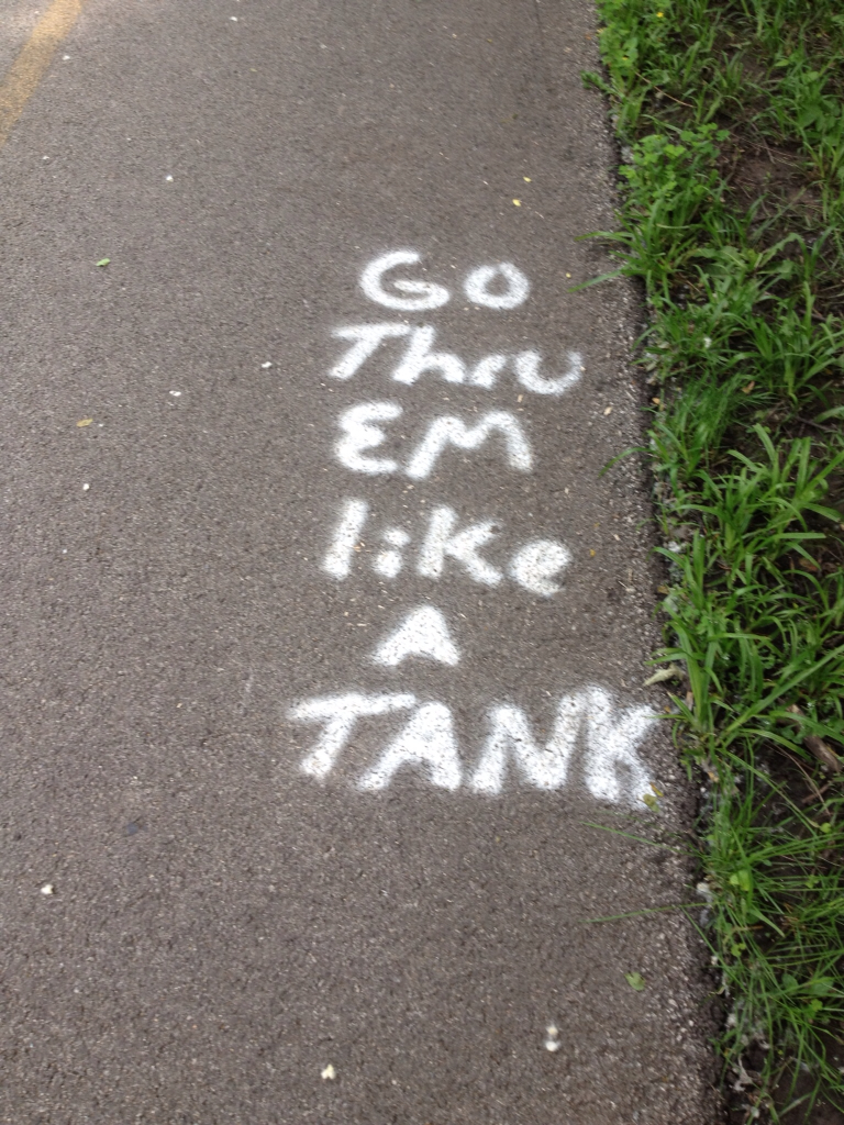 I realized I was going faster than my normal pace and was struggling but the voice in my head was so loud now, I could not drowned it out. That is when I passed a sign on the trail that said, “Run through them like a Tank”. I smiled and kept going. The fire of anger continued to grow as I recognized the voice taunting me….it was Wanda! That brutal bridge on the path was the one that was causing me to doubt myself and my ability.