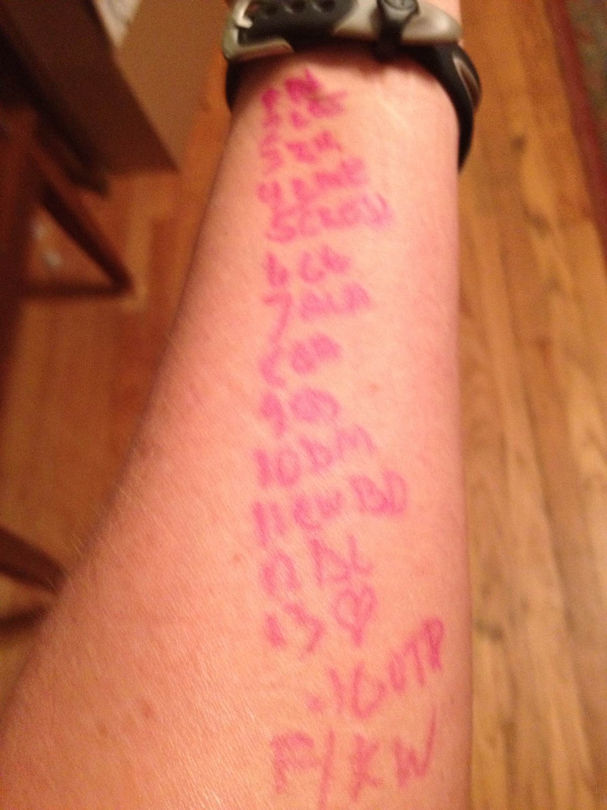 I wrote the miles and initials on my arm on race morning as a reminder of who and what and why I was running. It looked crazy but hey…I wear a tutu! Crazy is who I am! We drove to the race site, prepped at the car and then walked to the start.