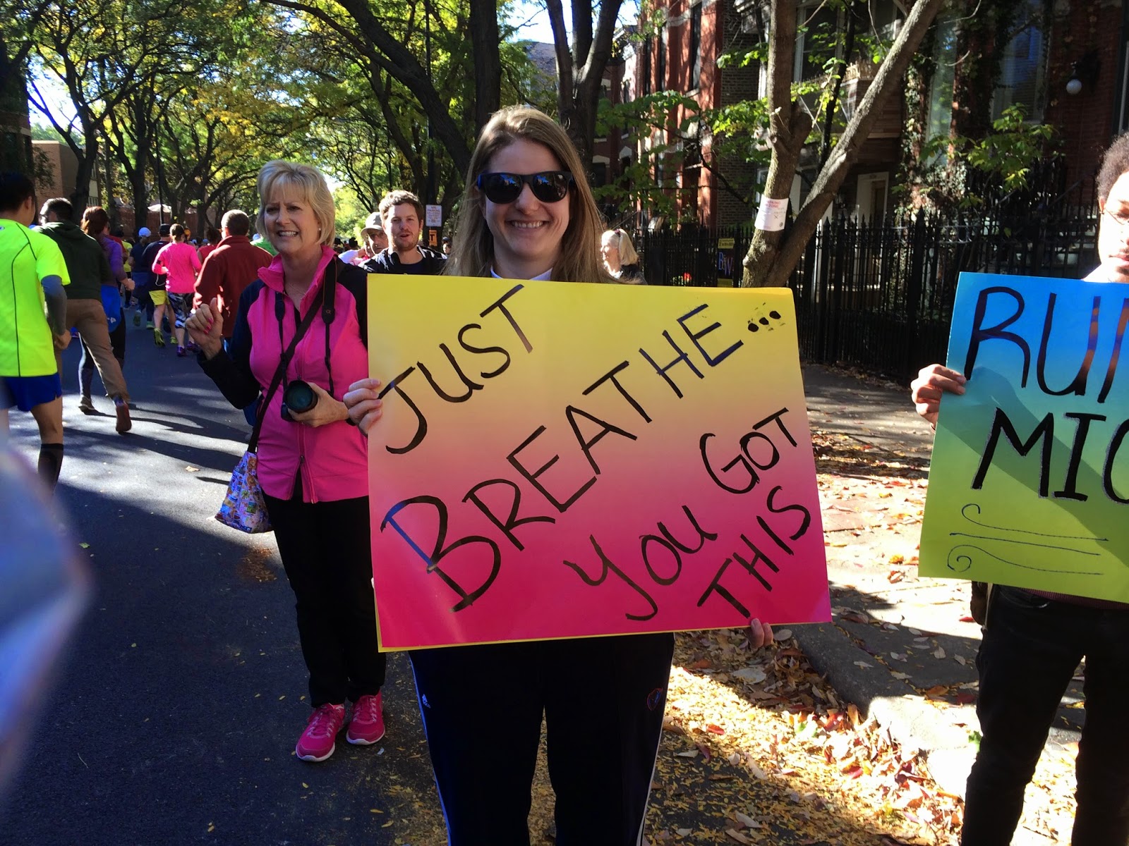 It is this back half of the marathon that things get tough and I was starting to feel  the miles adding up in my body.  My back was starting to become increasingly painful and I was needing walk brakes every so often. Running through Little Italy, I felt a tap on my shoulder. It was Father Rob, my good friend. I have said before that I do not believe in coincidences, that I believe in God-incidences and this was one of them. Every marathon…every race….that Father Rob and I run together we always see each other.  We may not start or finish together but he always seems to find me. 40,000 runners and he finds me.  He appears when I need him most every time. We ran a bit together and then he went ahead. Rounding the corner at Taylor and Ashland, as I thanked a cop, I realized it was one of my husband’s long time friends, Mark. He gave me a tight hug and sent me on my way, yelling that he would call my husband!