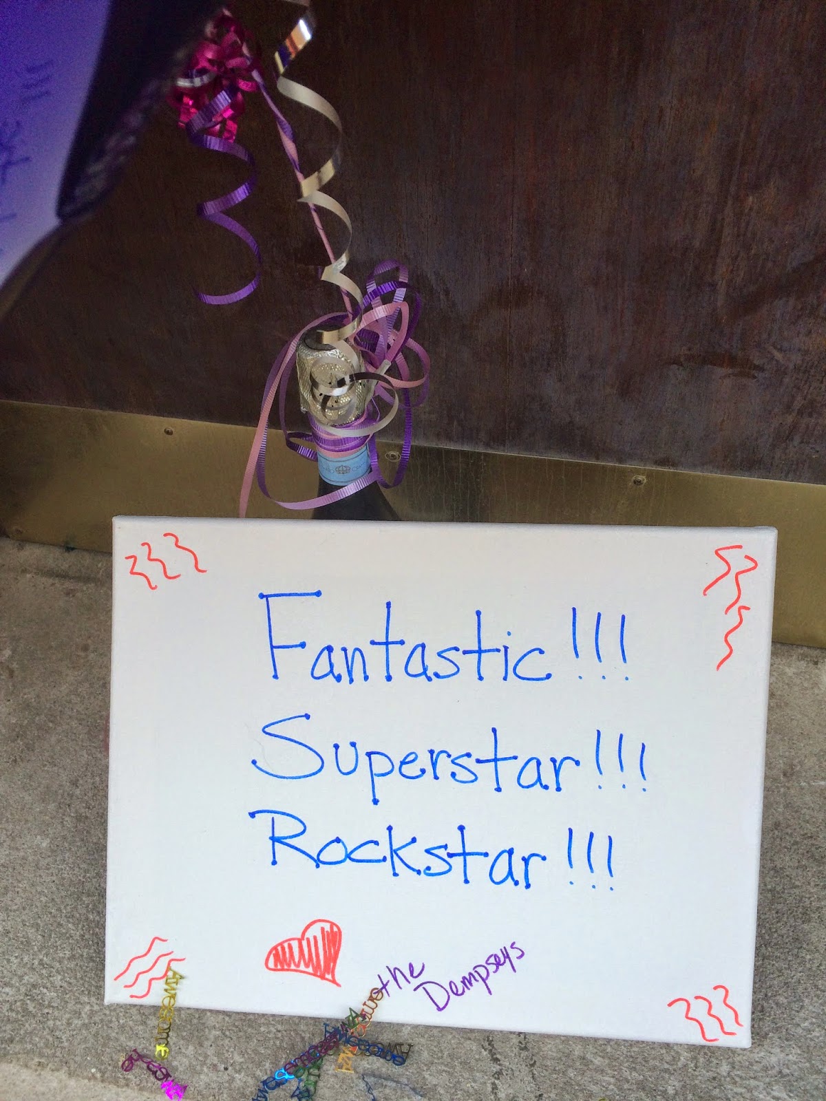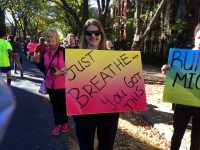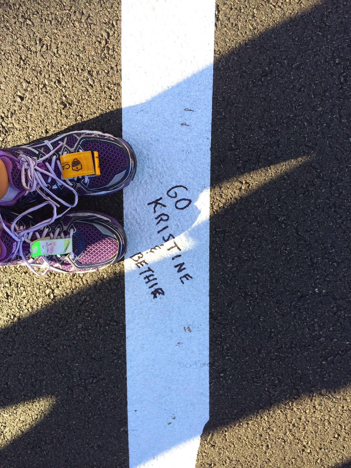 Earlier that morning, I received a notice  from my pal, Tim,  also a race day staff member,  that he had left a special message for Beth and me at mile 5. I was looking forward to this…and yes, I stopped in the middle of the course to take a photo…much to the dismay of the other runners! Thinking of my cousin, Melissa and her boys, my own kids, the children of friends and the kids I teach got me through the zoo  and to mile 6 where I saw a teacher friend, Kathleen. She had told me that she would be wearing a bright orange hat at the water stop….and I could see her from a ½ a mile away…a vision!  She gave me water, a hug and took my sweaty, icky gloves with glee and sent me on my way.