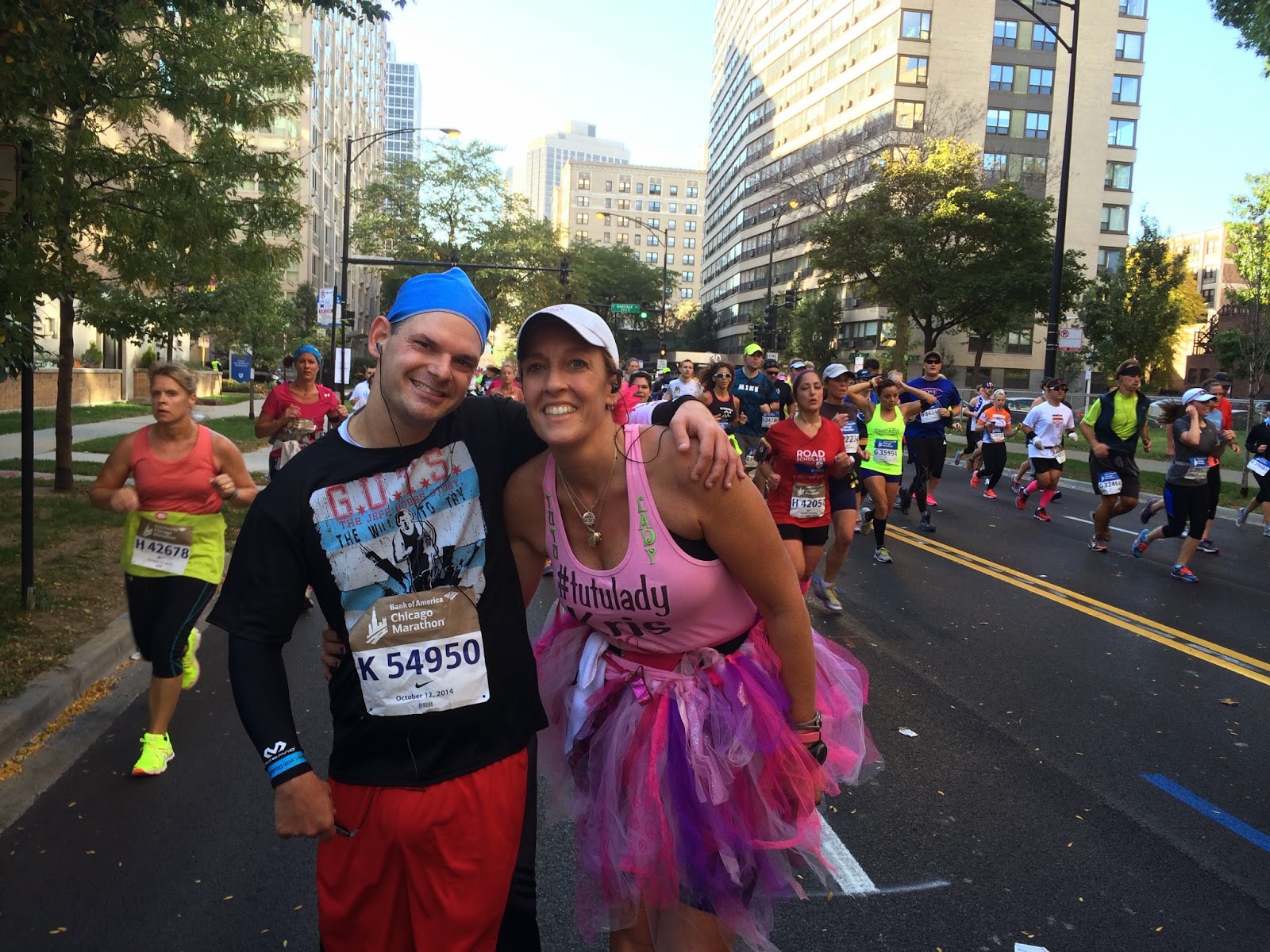 Entering Andersonville and Boys town is one of my favorite parts of the course.  There is always one person in the same spot every year with a sign that reads, “Do Epic S**t!!” I love that! Running this part of town thinking of my BRF (Best Running Friend), Sarah, and others in my group, reminded me how lucky I am to be able to do this race every year. Running has given me many gifts…some of those gifts are my lifelong friends. Heading into Lakeview, I got a tap on the shoulder. “Hey!  I know you!  You are my dad’s friend…the Tutulady from Long Beach!”  I turned to see Hal Higdon’s daughter!  We ran together for a few steps and talked and soon she was far ahead of me! Lakeview is also my husband’s district. Each year I thank every police officer I see on the course but in his district….all the cops get a hug!