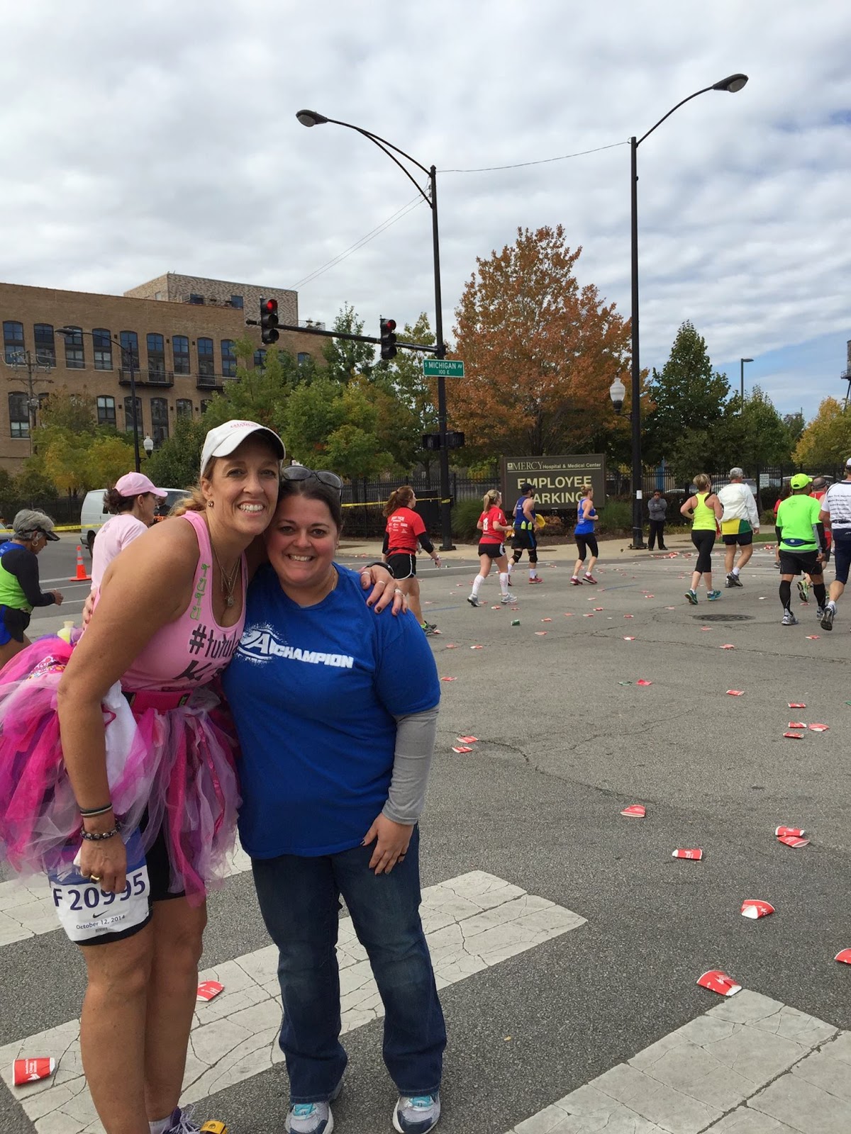 Michigan Avenue is a long lonely stretch of the course. It forces all of us runners to dig deep and finish strong. I was running in the middle of the road when a man in front of me grabbed his leg and then fell to the ground. He had a friend with him and I saw emergency personnel heading towards him so I pressed on.  This last mile was for two of the strongest women I know, my daughter, Courtney, and my friend, Kelly.  I summoned all their collective strength and pushed…..