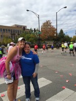 The first few miles are through downtown. I love this part of the course as the crowds are thick and loud.  Each year I allow people to choose a mile that they would like me to run for them and I dedicate that mile to that individual. I also ask each of my students for a song and put together a large playlist. The songs and dedicated miles are a good way for me to focus my running and gives me something to think about while covering 26.2 miles. The first mile was for a running and faith friend, Marian,  who supports Team World Vision so I spent the first mile looking for the cheering section for TWV. When I found them…I gave them each a hug, thanking them for supporting all runners!